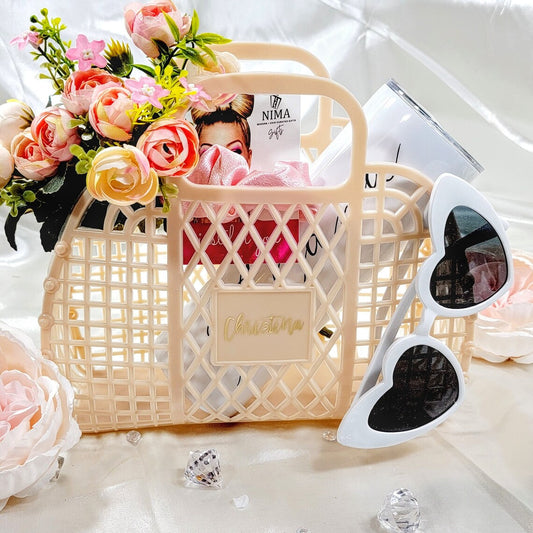 Beige Personalized Jelly Bag, Beach Bag, Plastic Straw Clutch, Flower Girl Clutch, Customized Hand Clutch, Bachelorette Party Bags - FGJB3