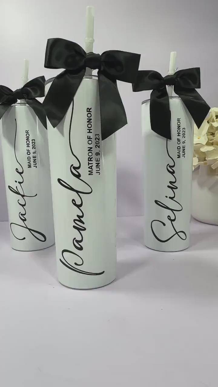 Personalized Bridesmaid Tumbler is a great addition to your bridesmaid proposal and keeps your beverage hot or cold for hours!! Great addition to your bridal shower or bachelorette party as bachelorette gifts, bridesmaid gifts, jr. bridesmaid gifts, flower girl gifts, maid of honor gifts or bachelorette party favors!!